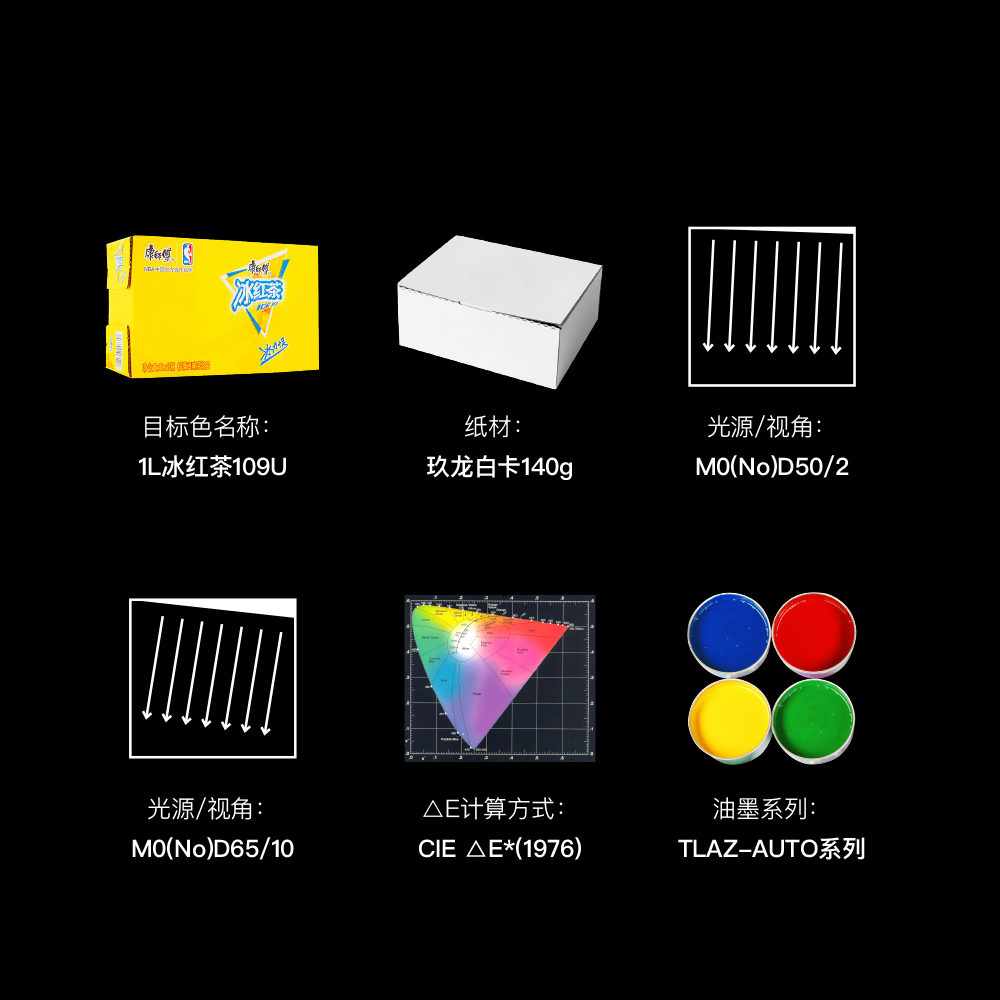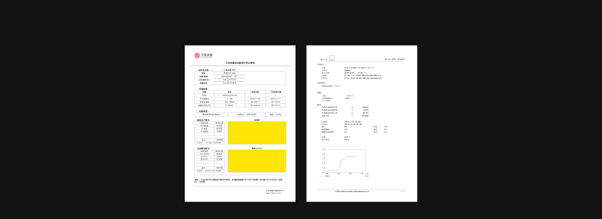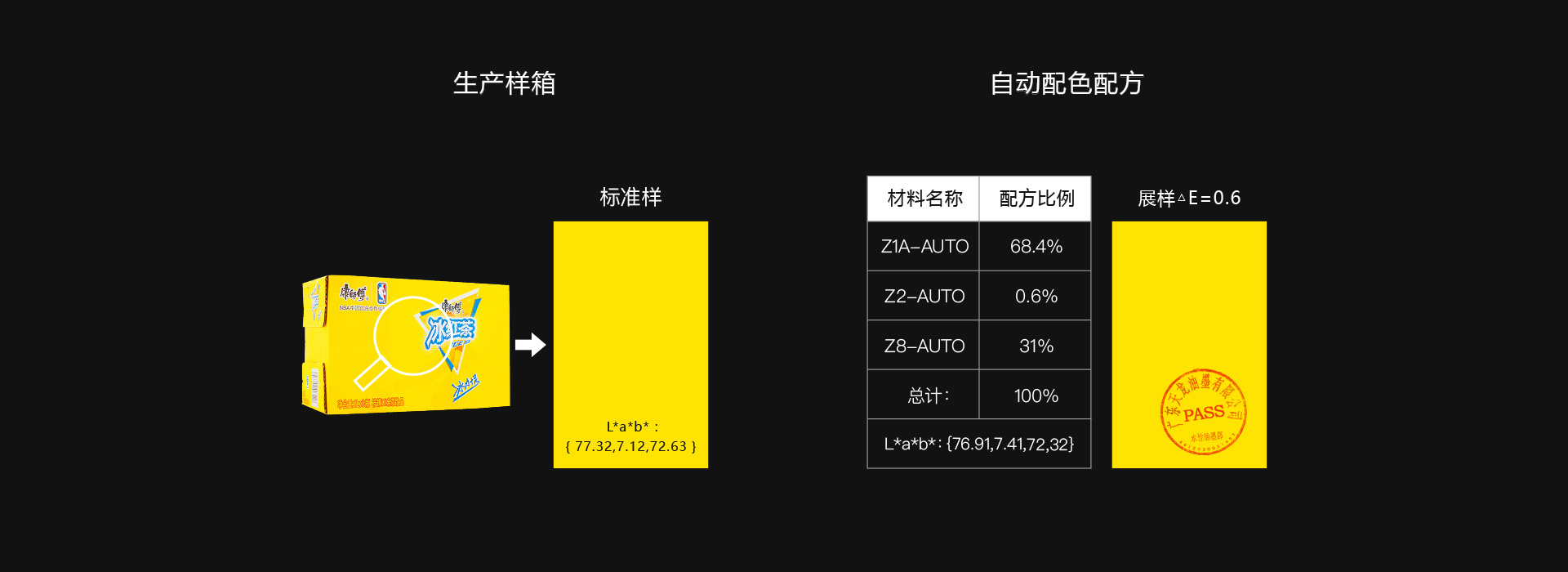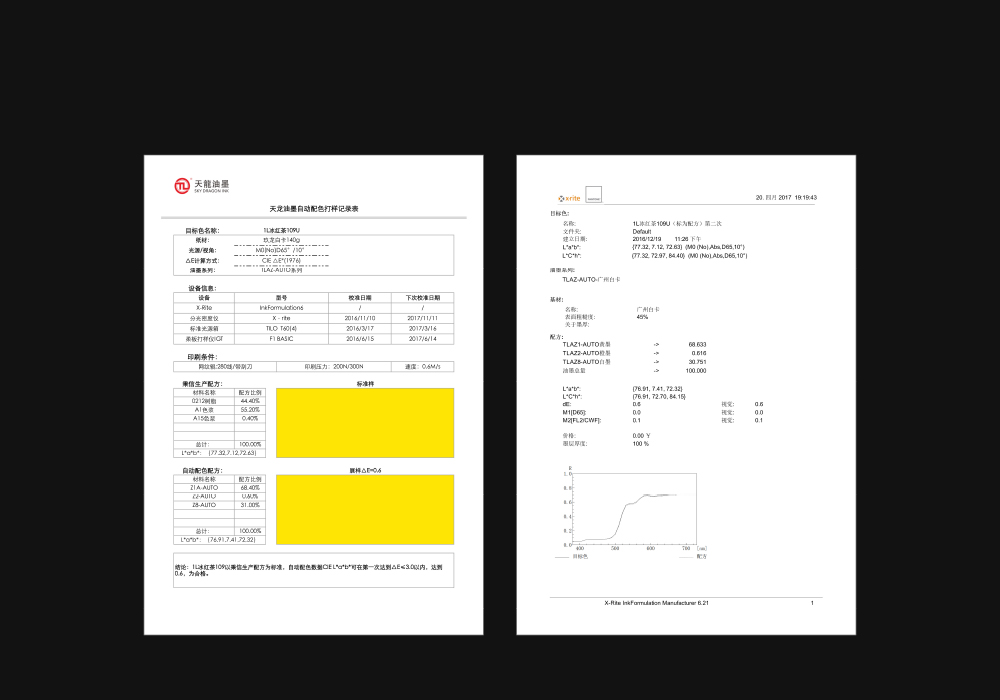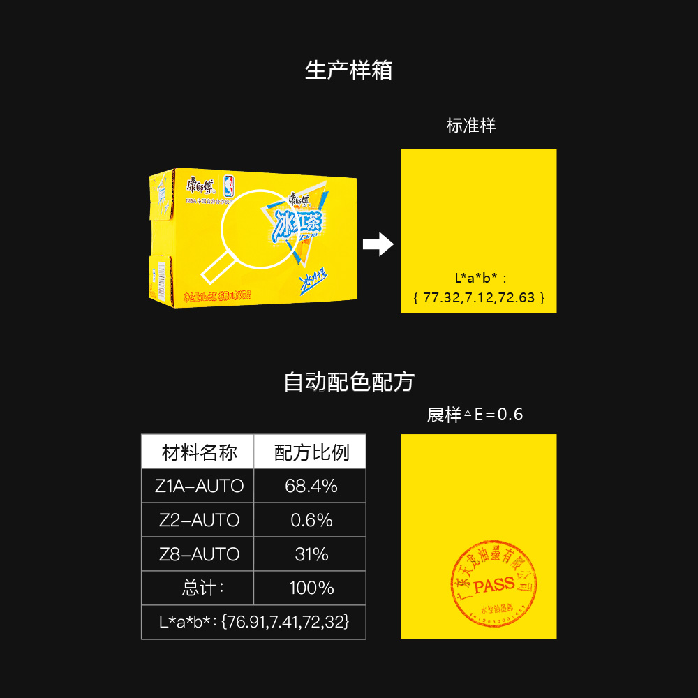 自動配色數據CIE L*a*b*可在第一次達到△E=0.6,在3以內,為合格。